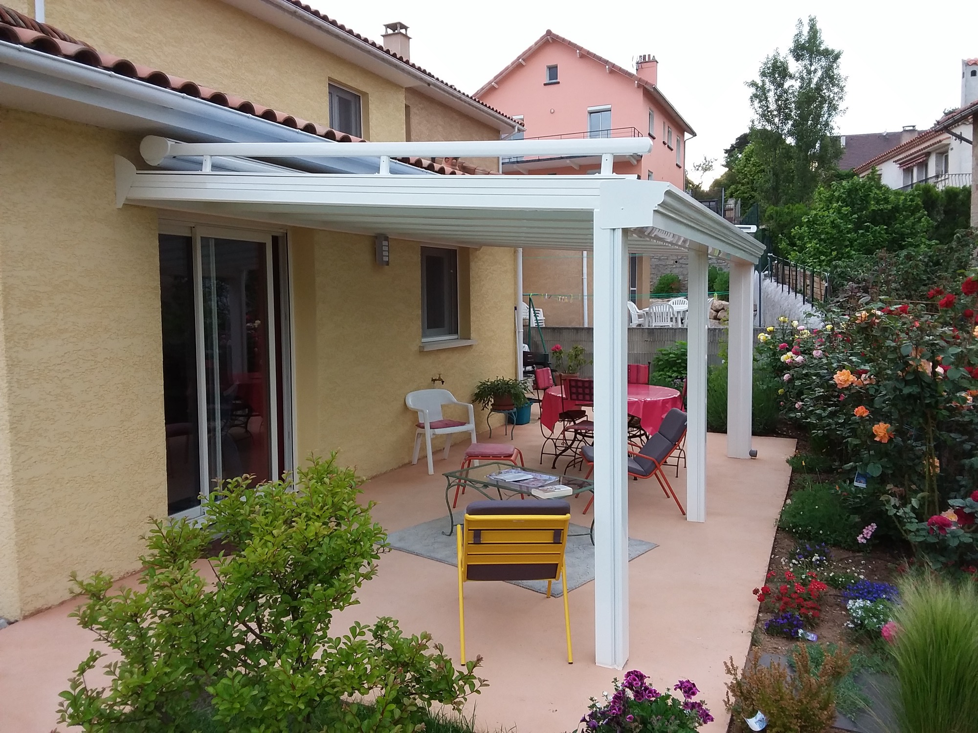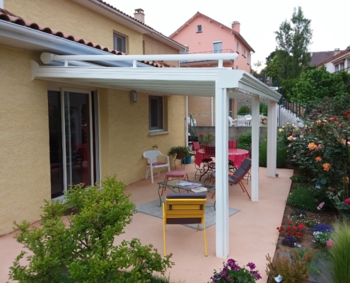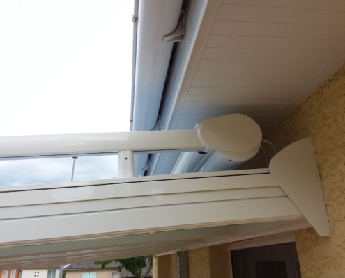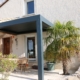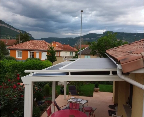 Mise en place d’un abri de terrasse en aluminium composé de panneaux en verre. La structure est conçue pour être évolutive, permettant ultérieurement la fermeture des côtés afin de créer une pièce supplémentaire. Pose d’un store extérieur en toiture pour limiter l’accumulation de chaleur et assurer une protection solaire efficace.