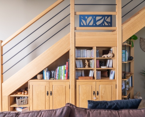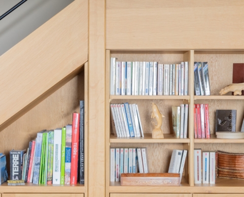 Conception et fabrication d’une bibliothèque sur mesure, parfaitement intégrée à l’escalier, permettant d’optimiser l’espace disponible et de valoriser la zone non utilisée.