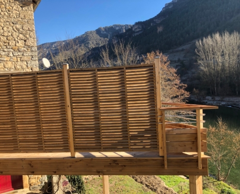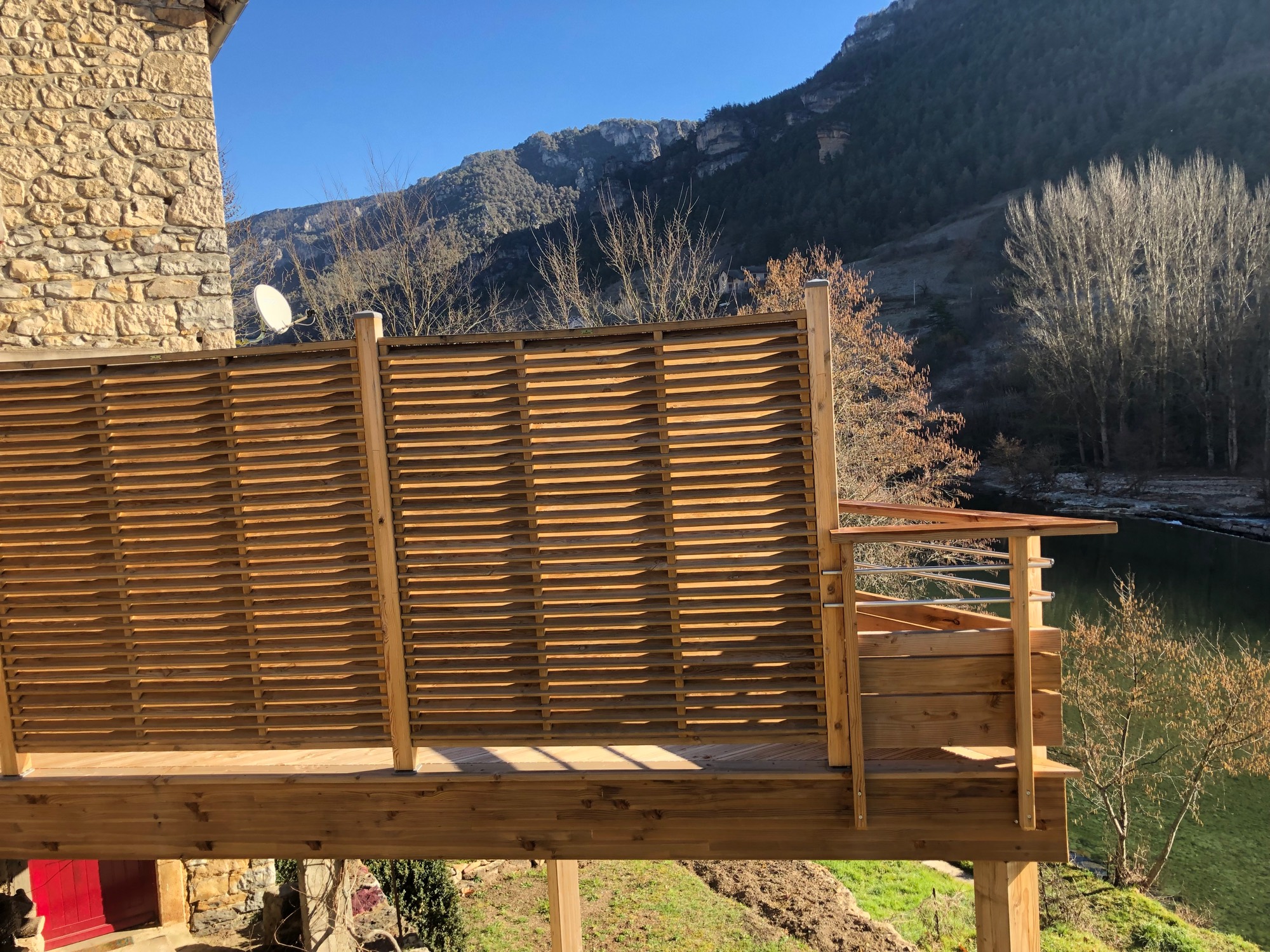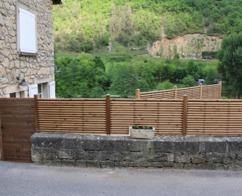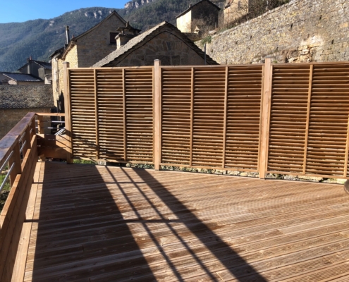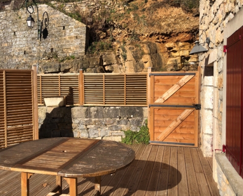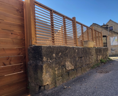 Pose de claustras en bois de Douglas à effet persienne, apportant légèreté et élégance à l’ensemble, accompagnée de la fabrication d’un portillon d’entrée assorti.