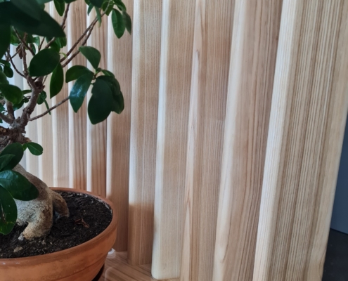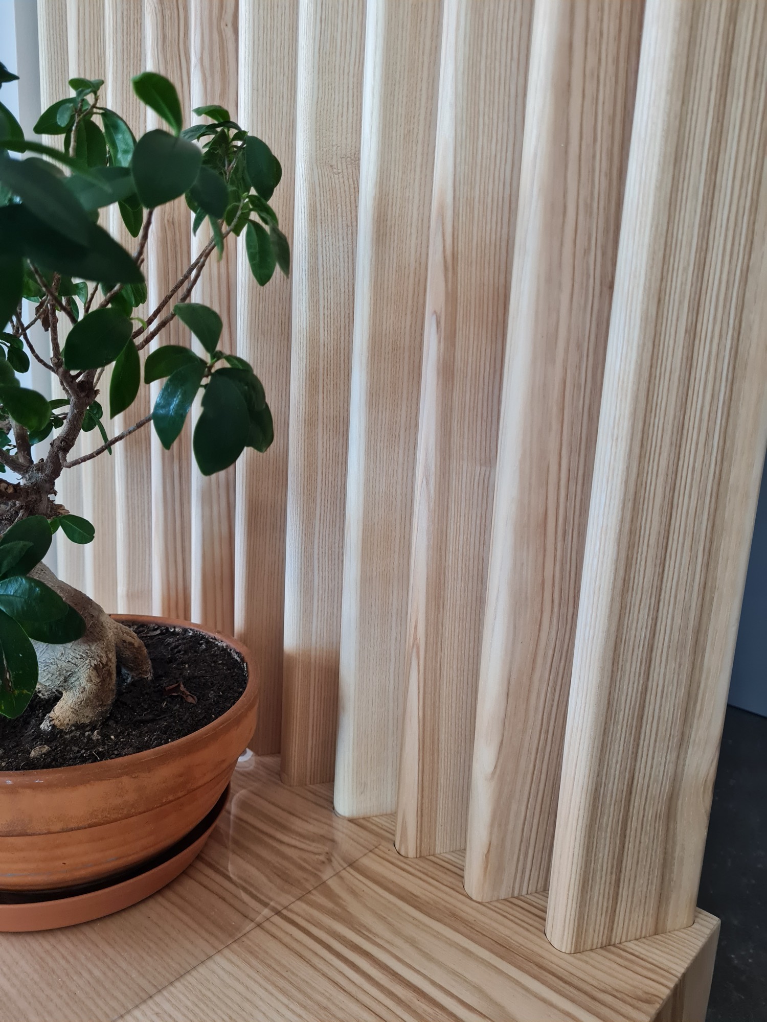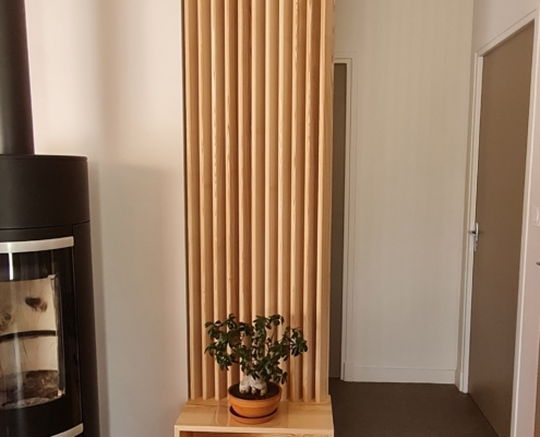 Fabrication sur mesure d’une cloison permettant de délimiter l’espace tout en intégrant une niche pratique pour le rangement du bois.