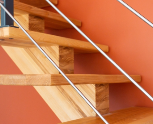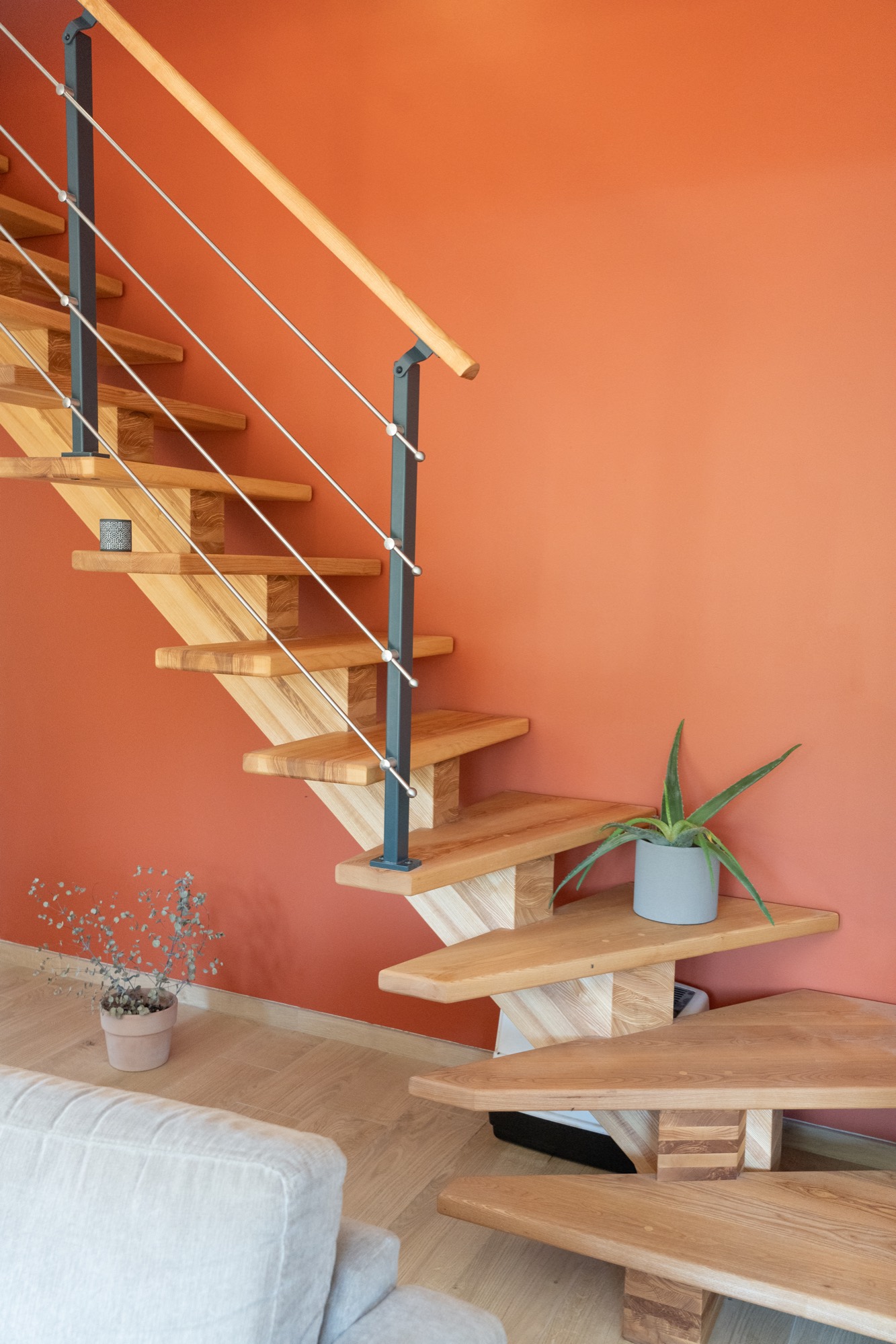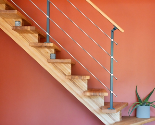 Mise en place d’un escalier en bois avec limon central, accompagné d’un garde-corps en métal et bois.