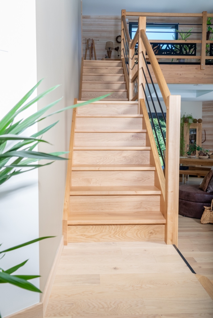 Réalisation sur mesure d’un escalier en bois de chêne massif, conçu pour allier esthétique, robustesse et qualité d’exécution.