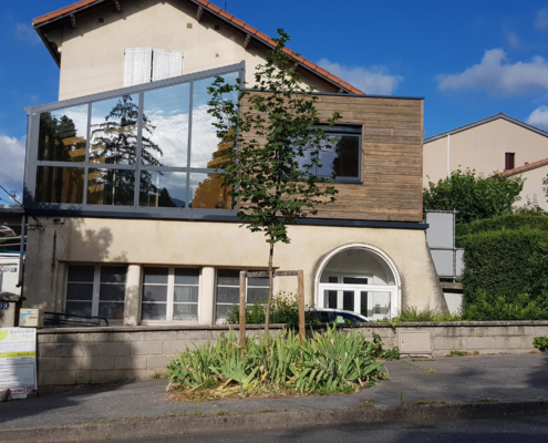 Réalisation d’un agrandissement en ossature bois construit sur la terrasse existante, intégrant une élégante véranda vitrée. Ce nouvel espace prolonge la pièce de vie tout en offrant une ouverture lumineuse sur l’extérieur.