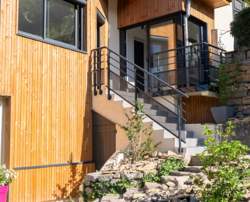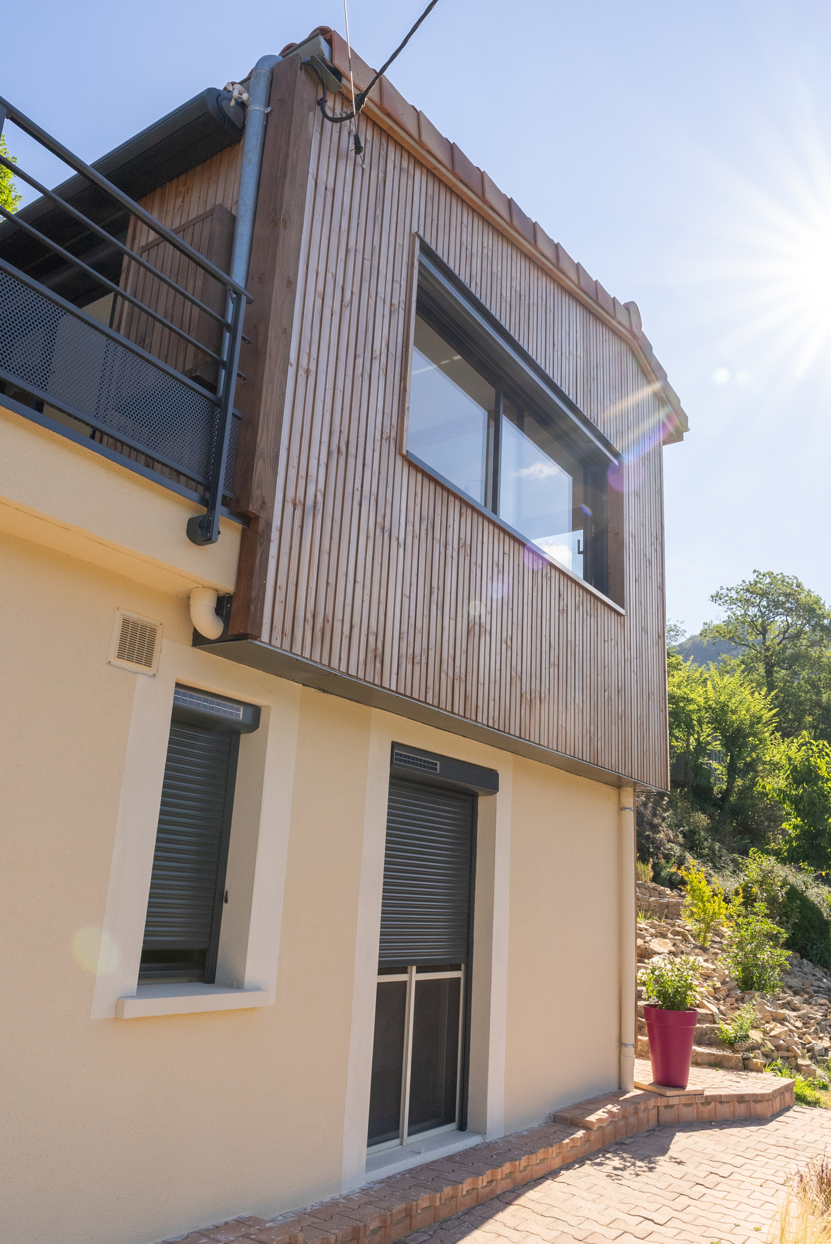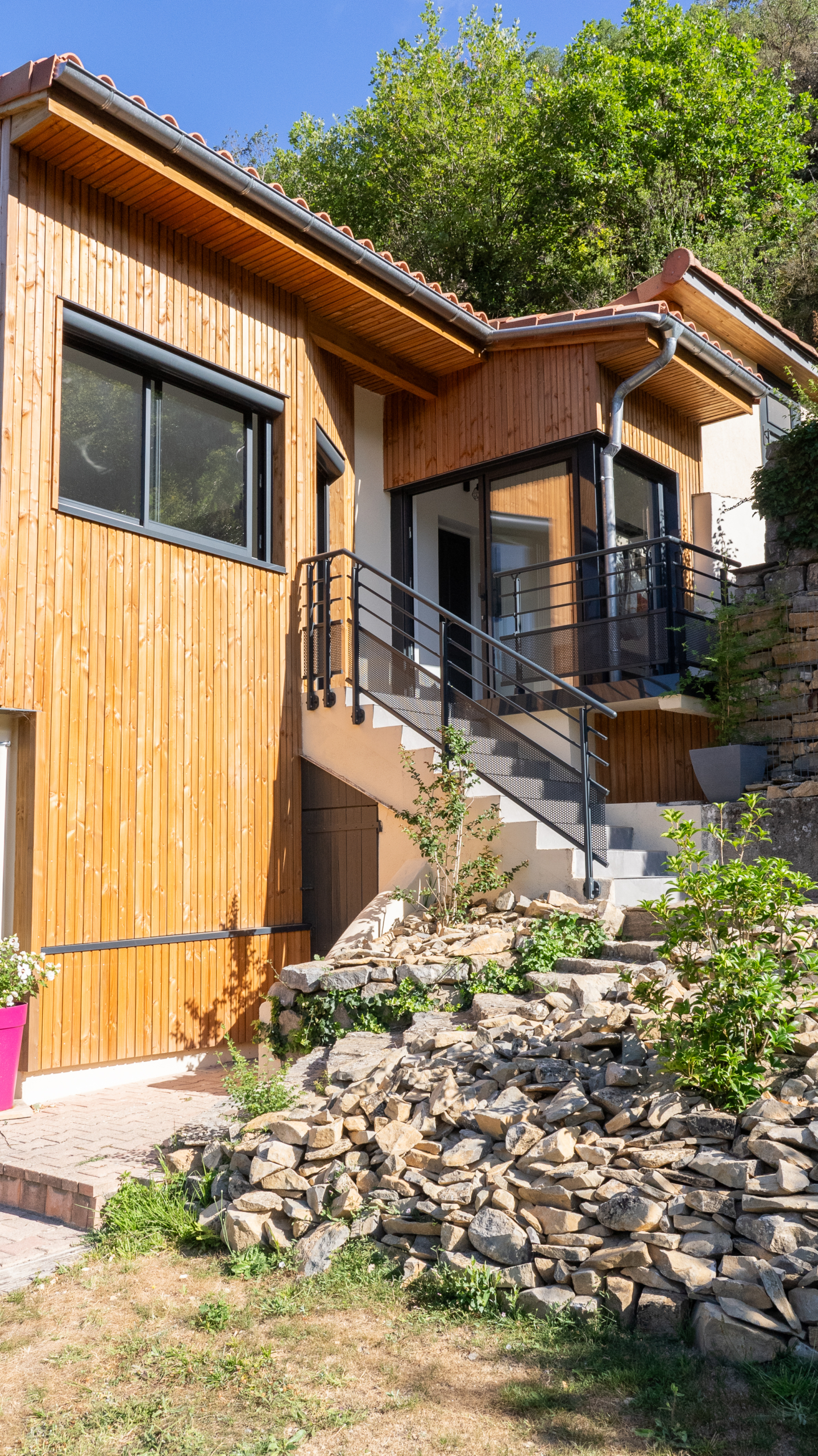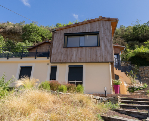 Réalisation d’une extension à ossature bois, pensée pour agrandir la pièce de vie et accueillir un salon lumineux. Les larges baies vitrées ouvrent l’espace sur les montagnes, baignant l’intérieur de lumière naturelle et créant une parfaite harmonie entre intérieur et paysage.