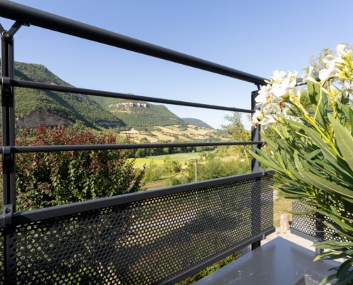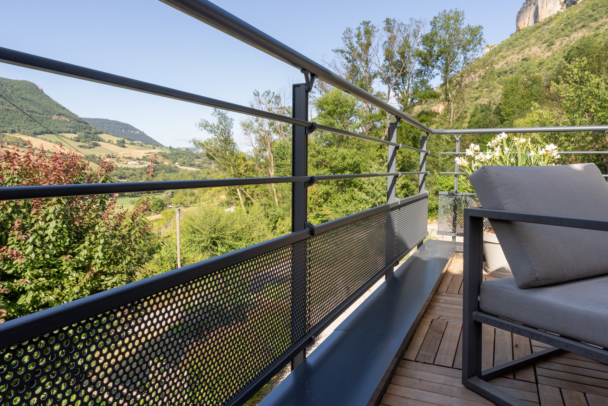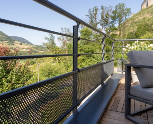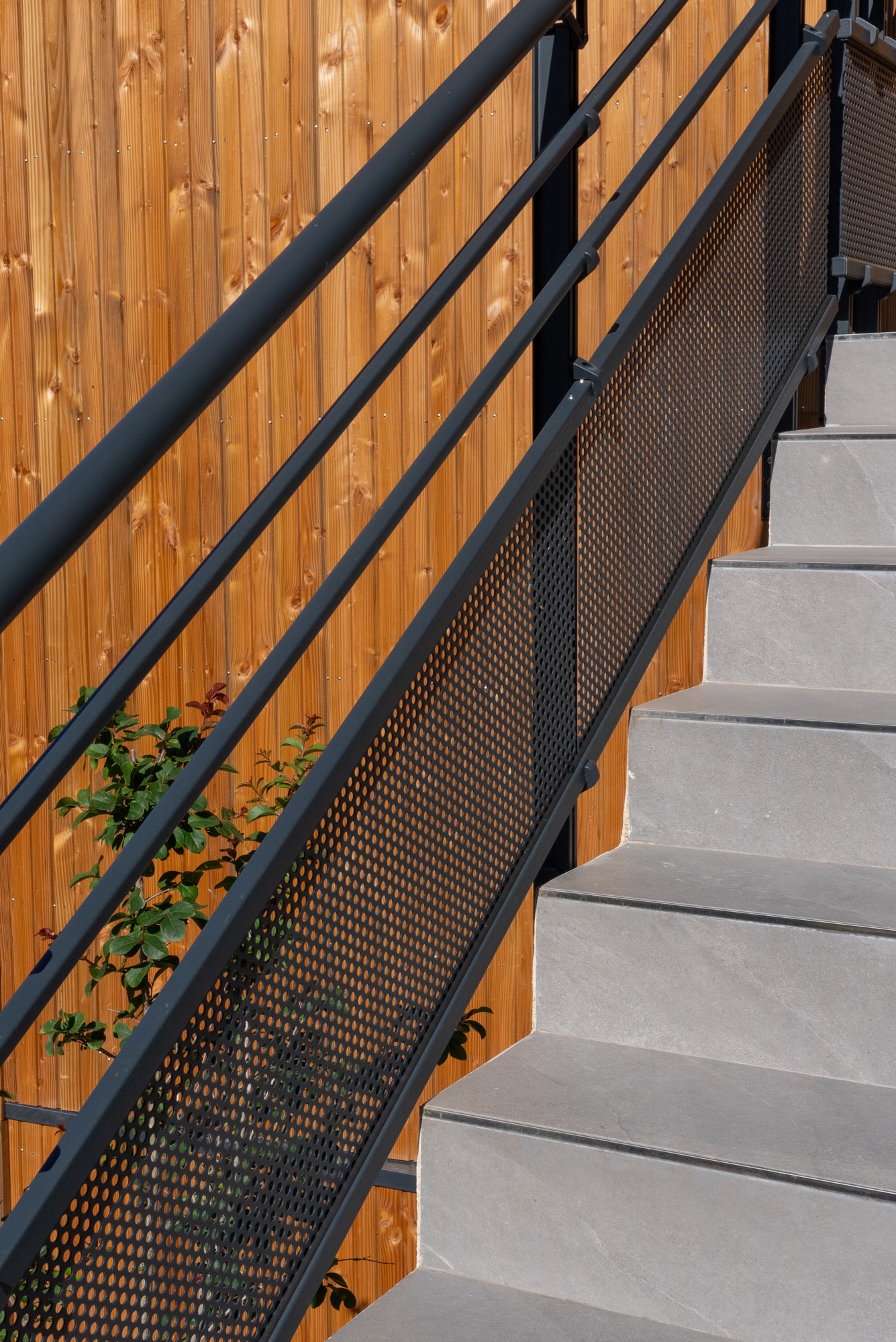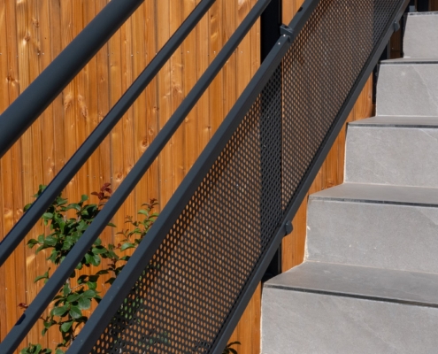 Installation d’un garde-corps en aluminium gris anthracite pour une terrasse et un escalier, alliant sécurité, esthétisme et durabilité.