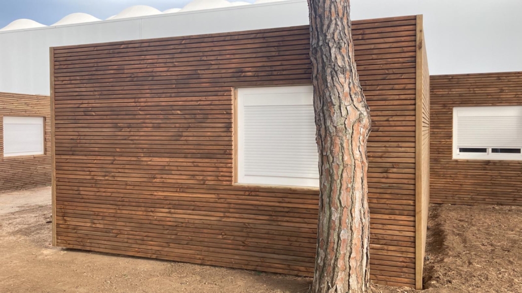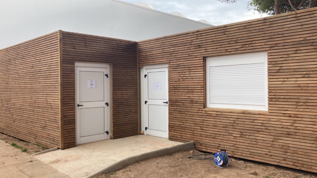 Habillage en bardage bois d’un algéco, offrant une nouvelle esthétique plus chaleureuse et intégrée à son environnement.