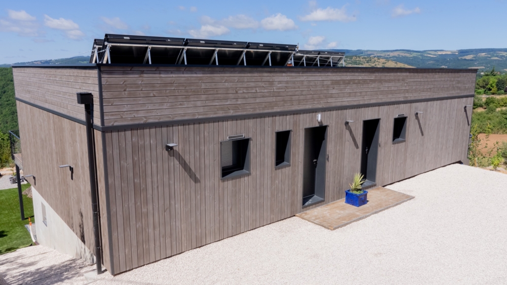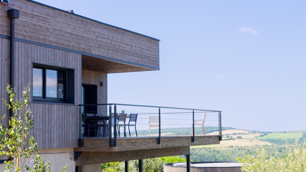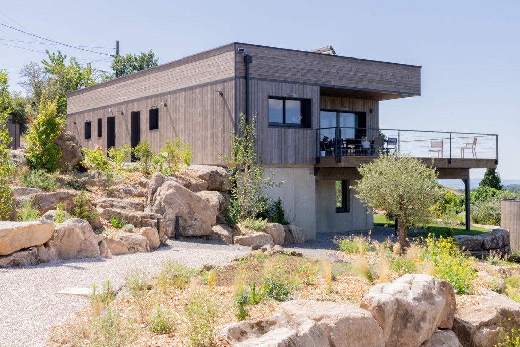 Conception et réalisation d’une maison à ossature bois, dotée d’une terrasse extérieure offrant une vue imprenable sur la vallée. Toiture plate avec installation de panneaux solaires, garantissant une démarche écologique et une autonomie énergétique optimisée.