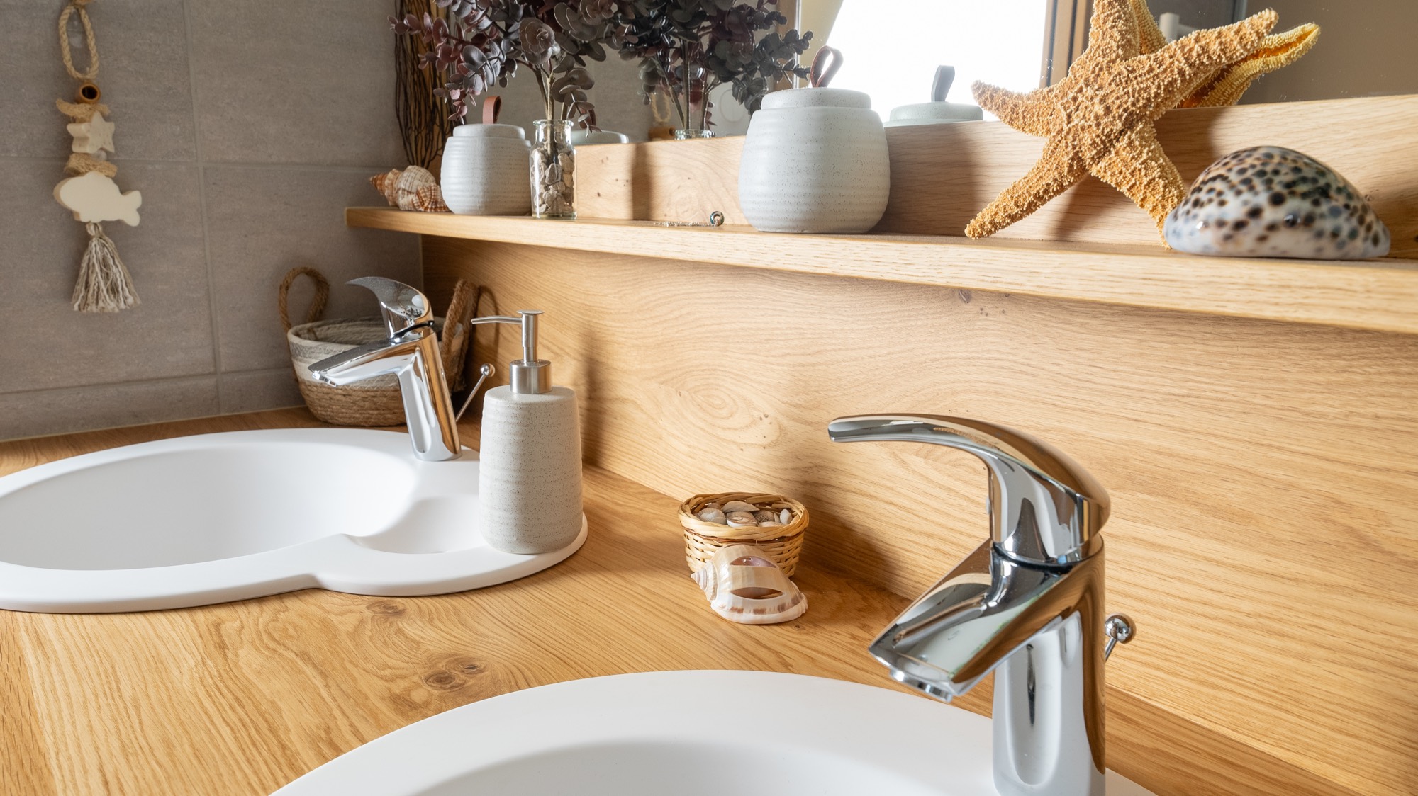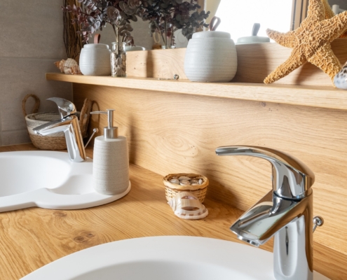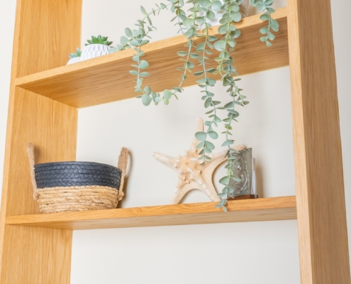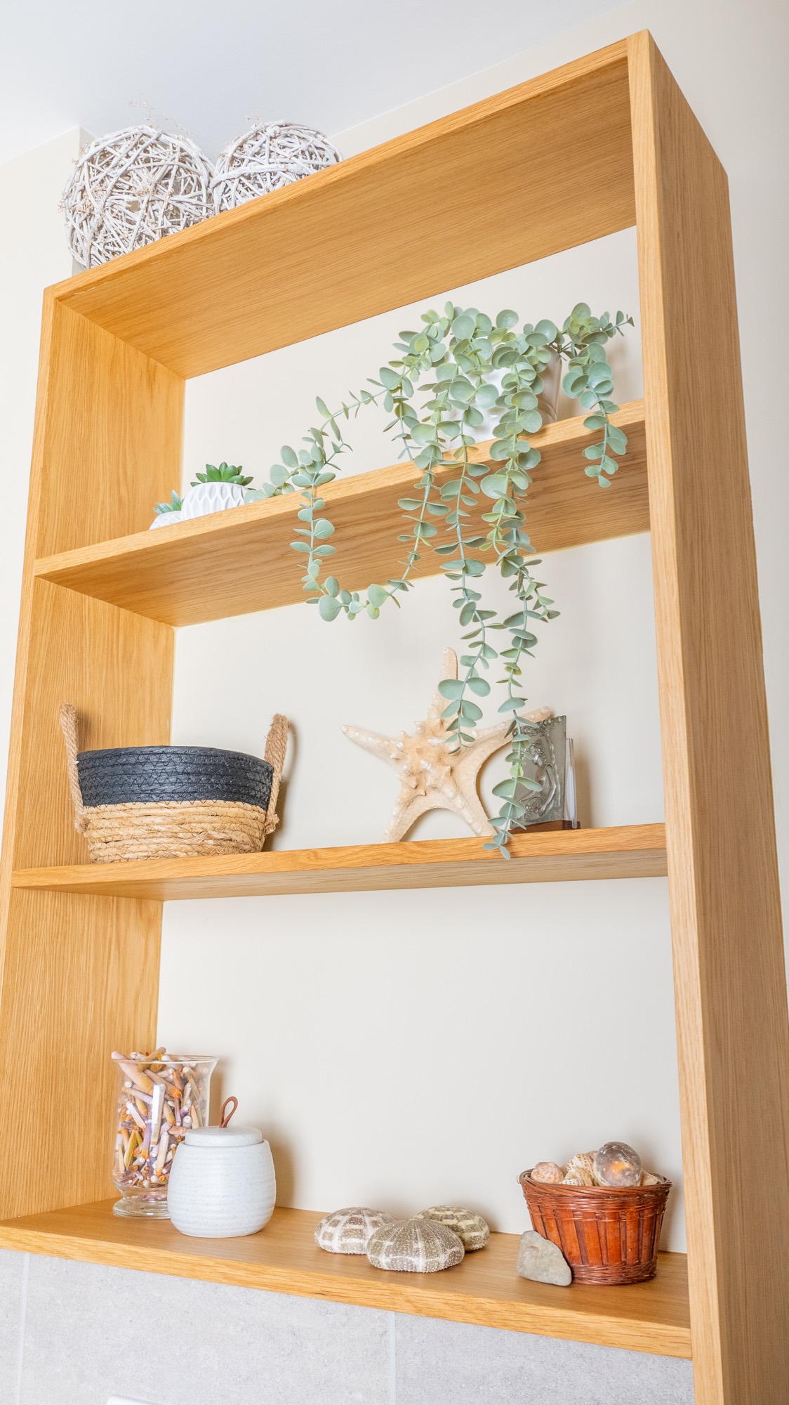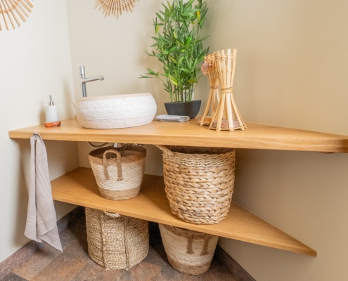 Conception et fabrication de mobilier en chêne sur mesure, comprenant un meuble de salle de bain, un plan de travail et des étagères, alliant esthétique et fonctionnalité.