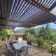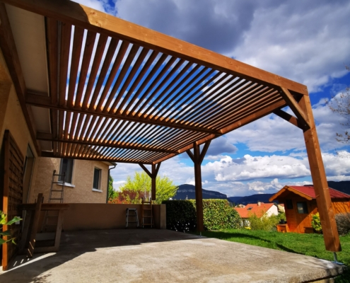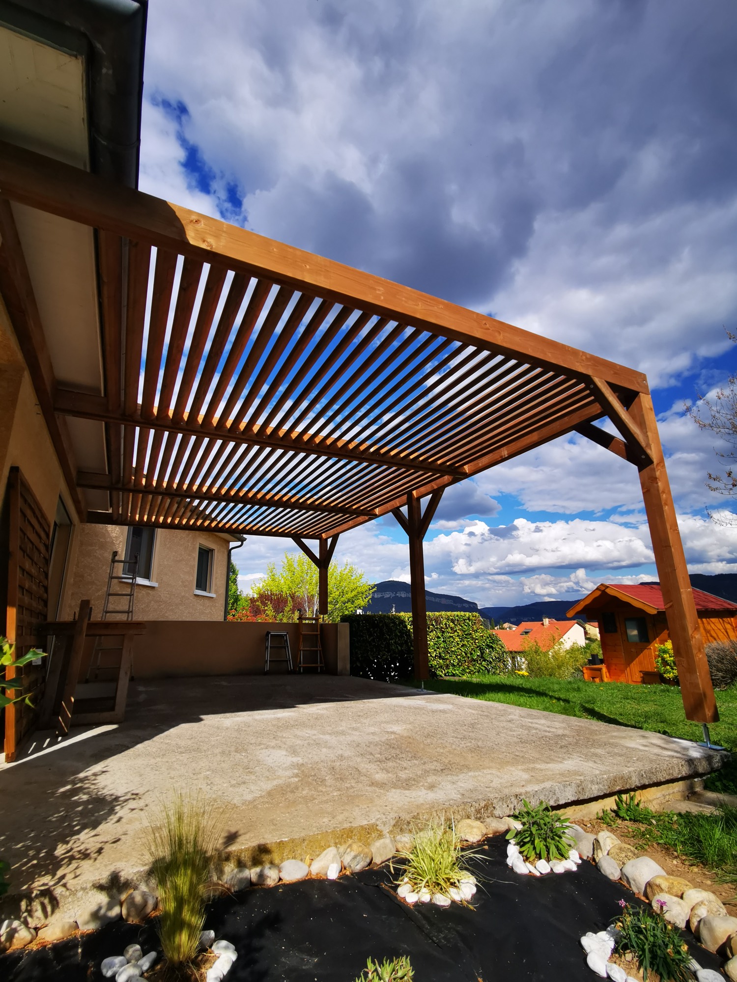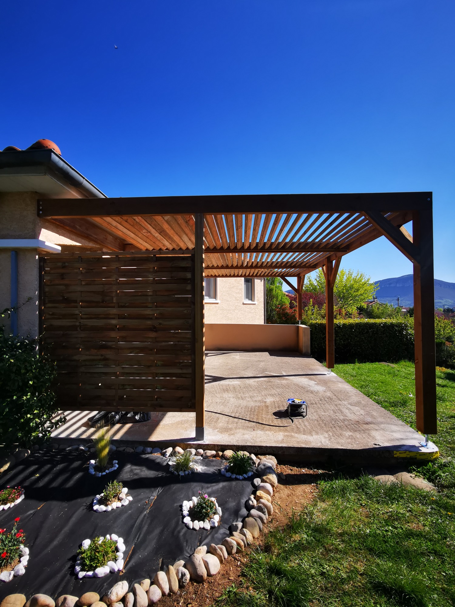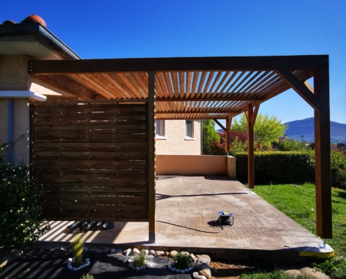 Conception et fabrication d’une pergola en bois de Douglas finition marron, accompagnée de la pose d’un claustra destiné à préserver l’intimité des lieux.
