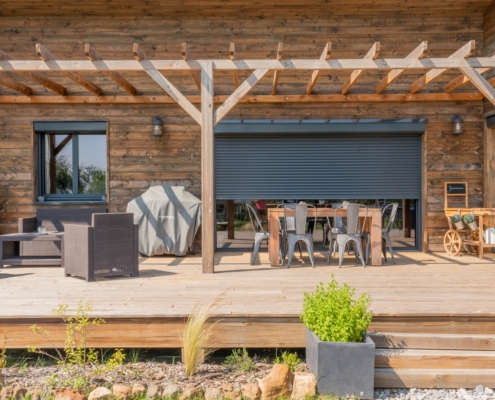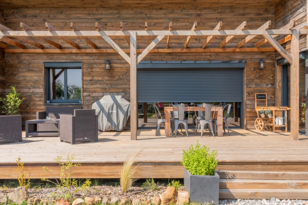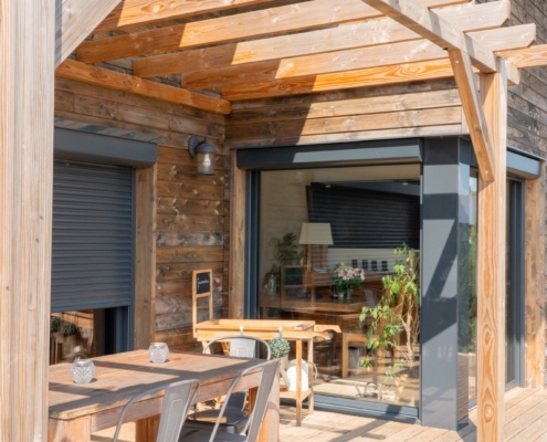 Fabrication et pose d’une pergola sur mesure en bois de Douglas, adaptée à la terrasse, avec possibilité d’ajouter des toiles tendues pour l’ombre.