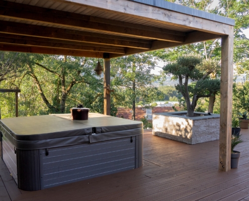 Pose d’une pergola en bois de Douglas avec toiture étanche, offrant un abri adapté pour un jacuzzi.