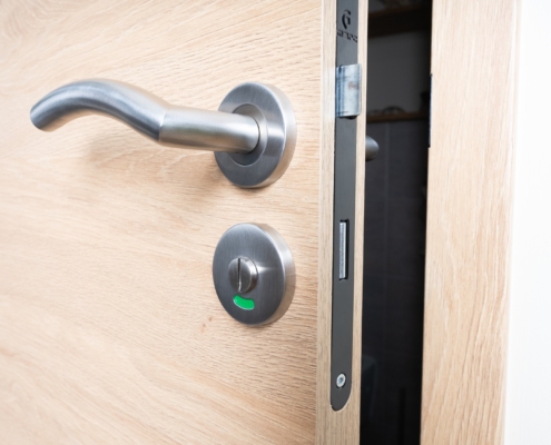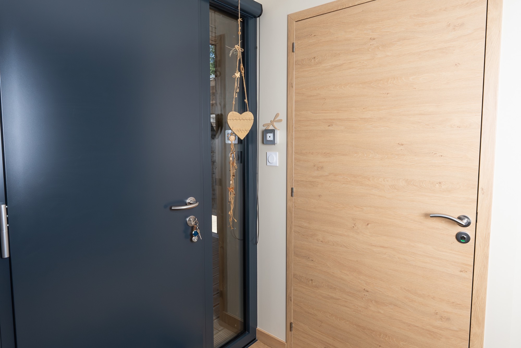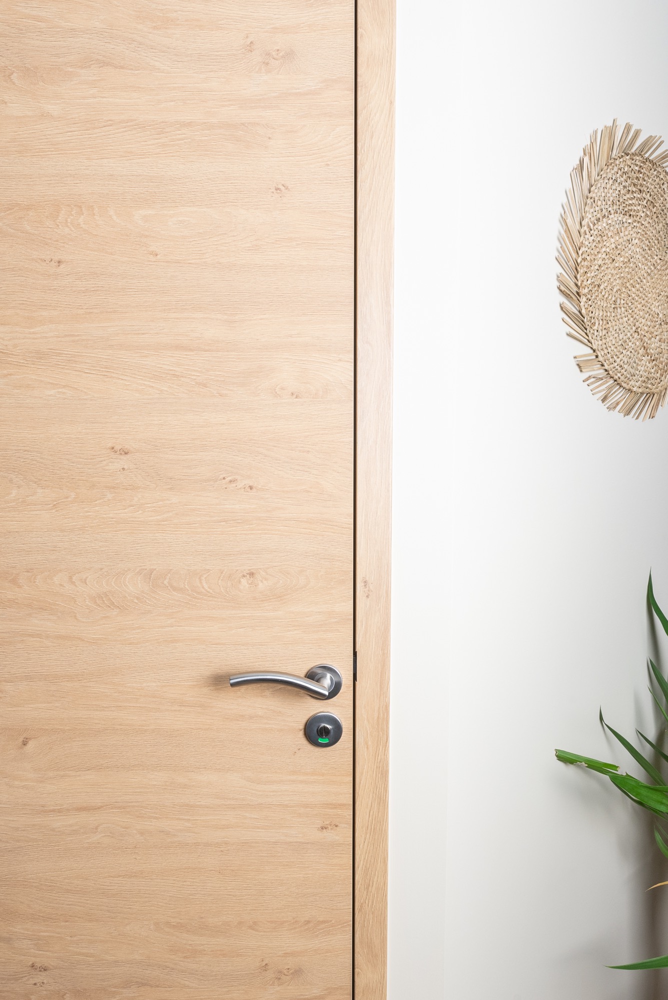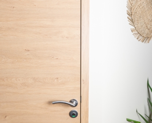 Mise en place de portes intérieures battantes en mélaminé, couleur ton bois.