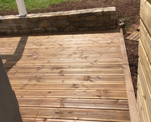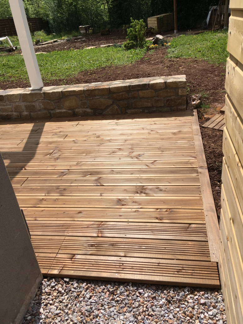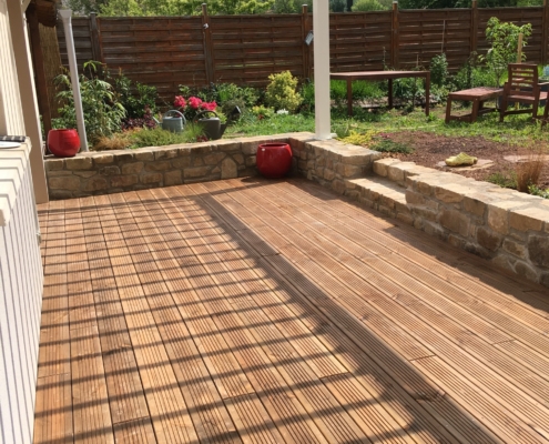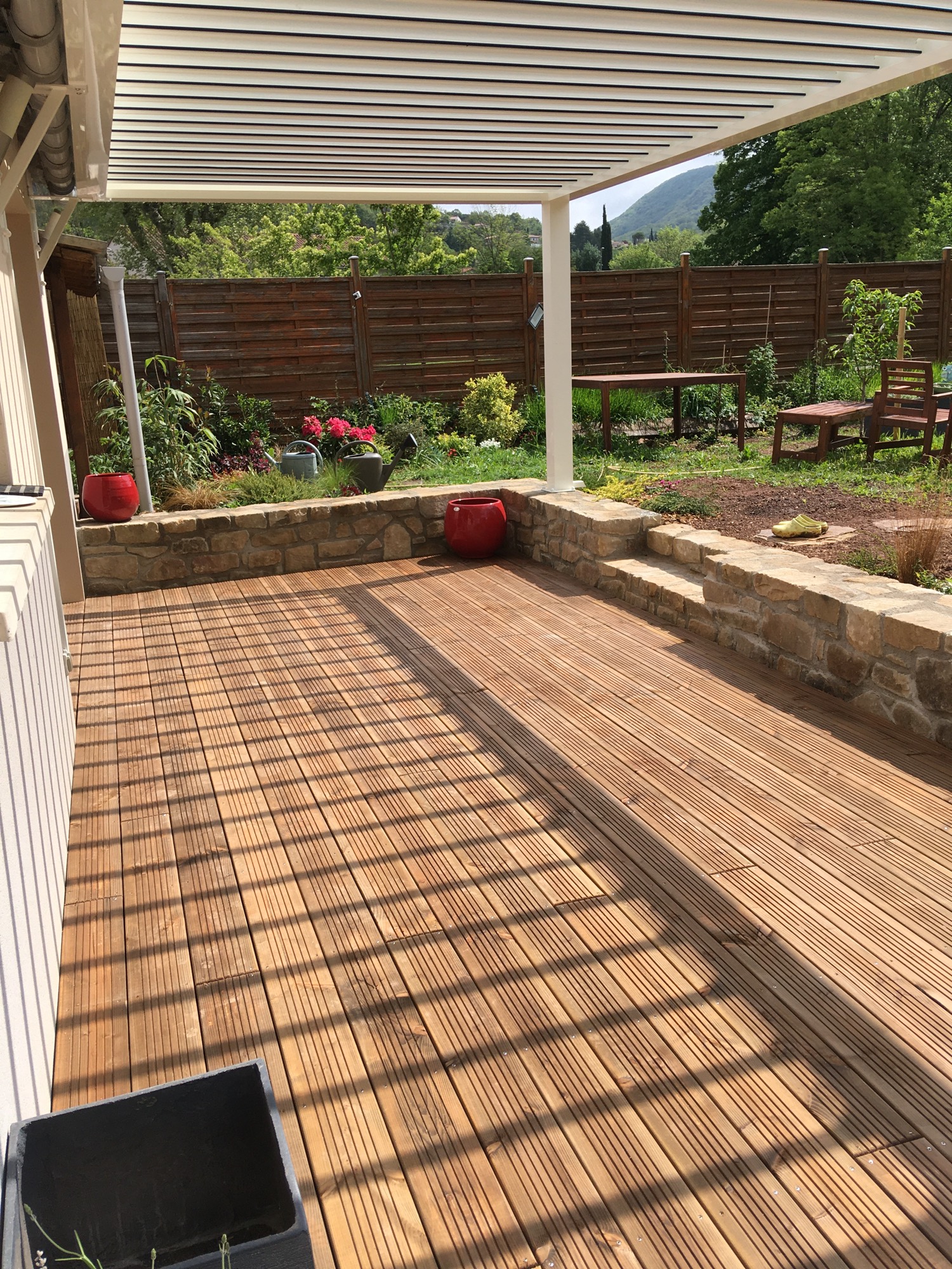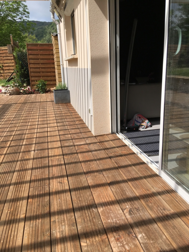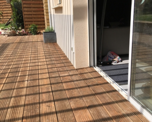 Conception et réalisation d’une terrasse en bois de Douglas, offrant un rendu chaleureux et naturel, parfaitement intégrée à son environnement extérieur.