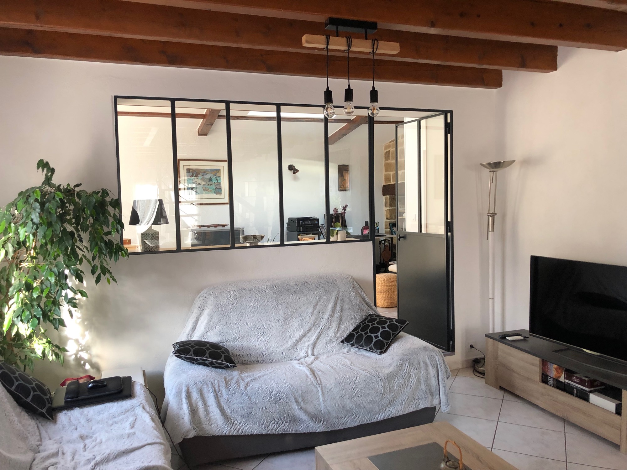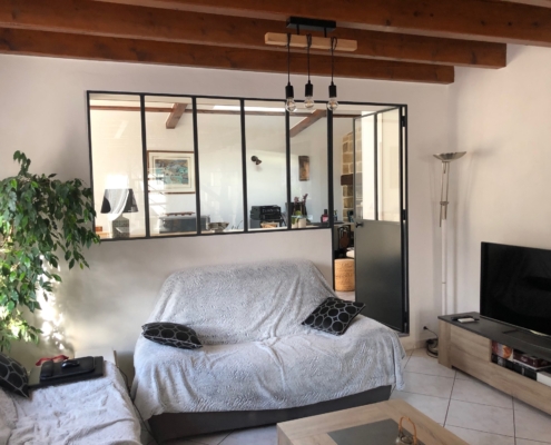 Installation d’une verrière en aluminium gris anthracite, servant de séparation entre les pièces.